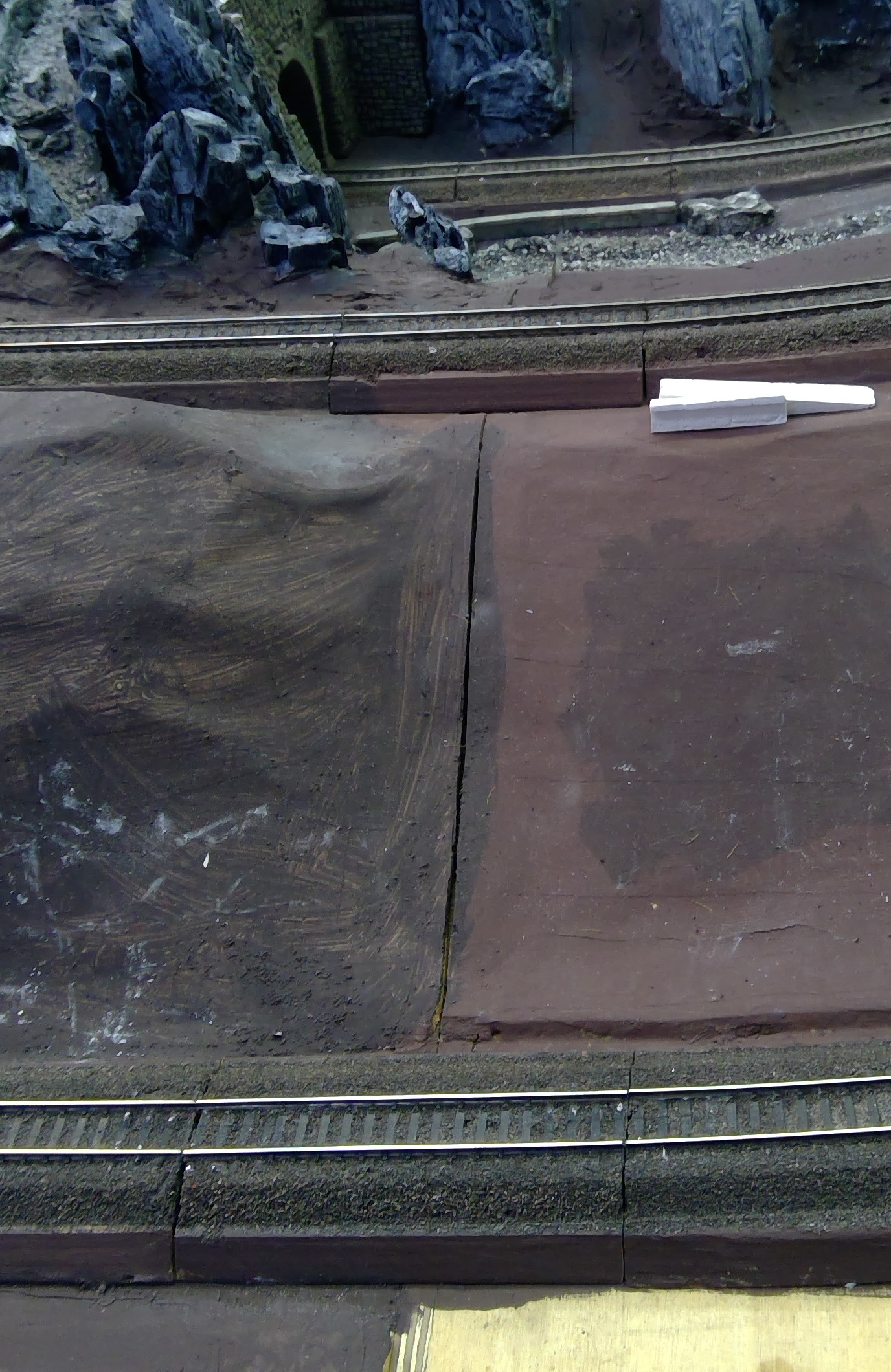 Beim Verlegen der Gleise werden die Gleisenden mit Modulübergängen der Firma Digitalzentrale gesichert. Nachdem die Gleise verlegt und angeschlossen sind, wird durchgängig geschottert. Sobald der Schotter leicht abgebunden hat, werden die Trennstellen vorsichtig mit einem Cuttermessser getrennt.